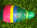 Konrad war meine erste Skulptur, hergestellt nach einem Vorbild, das ich in einer Tübinger Galerie gesehen habe. Sein Kern besteht aus einer leeren Flasche und bemalt ist er mit bunten Acrylfarben. Der erste Konrad konnte noch nicht alleine stehen und musste durch einen Ständer gestützt werden, Nachfolge-Modelle stehen aber auf eigenen Beinen.