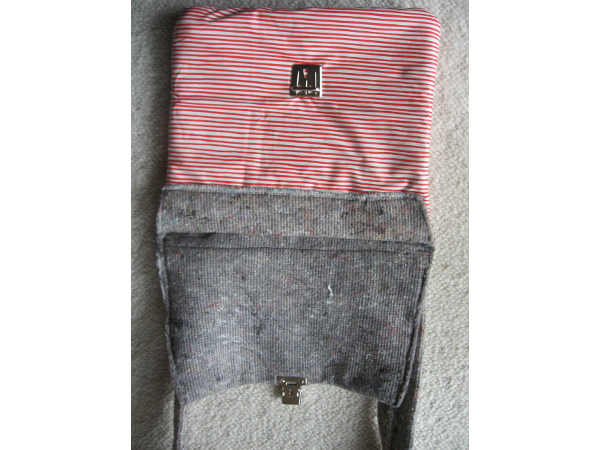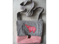 Auch Nashörner riechen gern an Blumen... Kleine Tasche aus Umzugsdecke mit Nashorn Applikation, Blumenknopf und großer roter Schnalle.